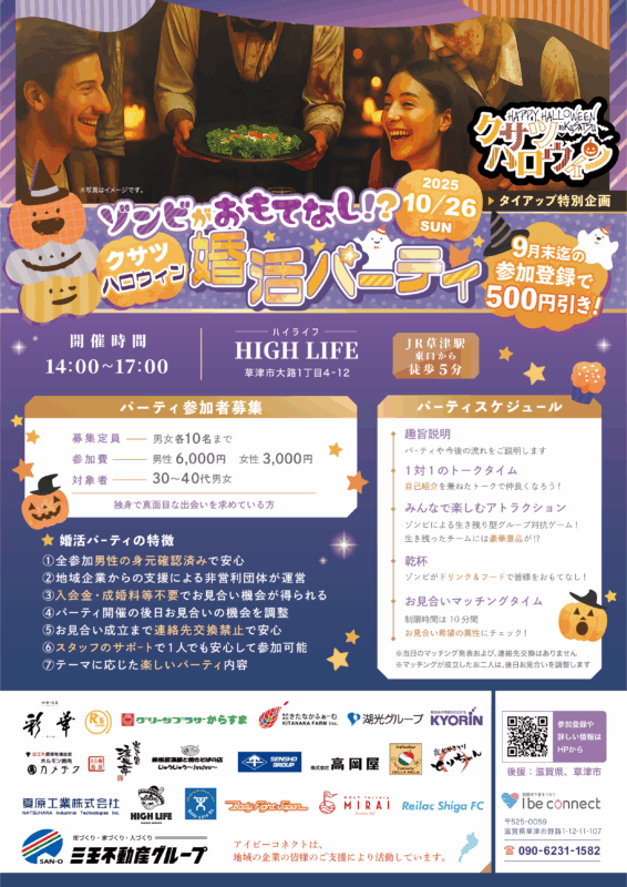 非日常感あふれる特別な婚活パーティー!ゾンビになって楽しむ企画や、みんなで盛り上がれるアトラクションなど、ユニークな仕掛けが満載です!一人参加も大歓迎!スタッフのサポートもあるので、初めての方も安心してご参加いただけます。気の合う仲間や運命の人との出会いを見つけましょう!