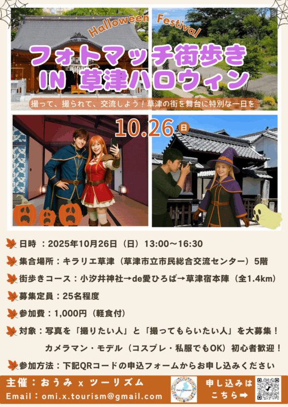 歴史ある草津の街を舞台に、カメラマンとコスプレイヤーが出会い、とびきりの一枚を残せる特別な体験。小汐井神社や草津宿本陣など、風情あるロケーションでハロウィンの思い出を作ろう!撮りたい人も撮られたい人も大歓迎!